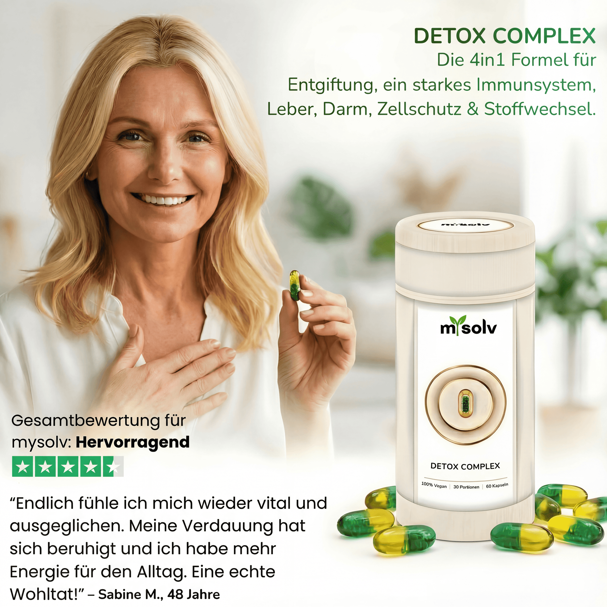Der mysolv 4in1 Complex nutzt eine Hochdosierte intelligente Dual-Technologie: Die Kraftvollsten Antioxidantien wie Carvacrol und Thymochinon (aus Oregano- & Schwarzkümmelöl) stärken die Abwehr, während spezielle Algen-Mikroperlen die Entgiftung im Darm erst wirklich starten und unterstützen.
